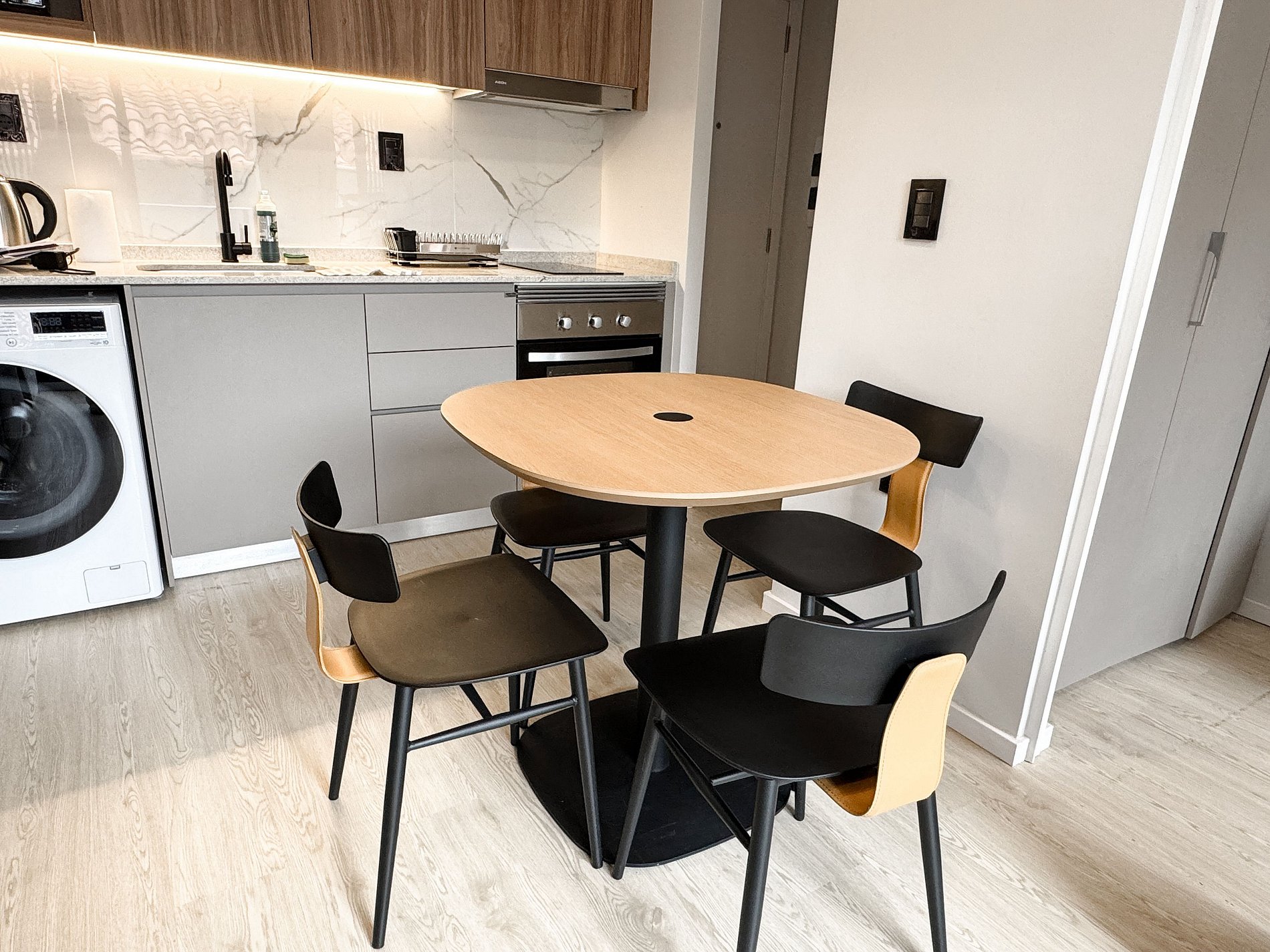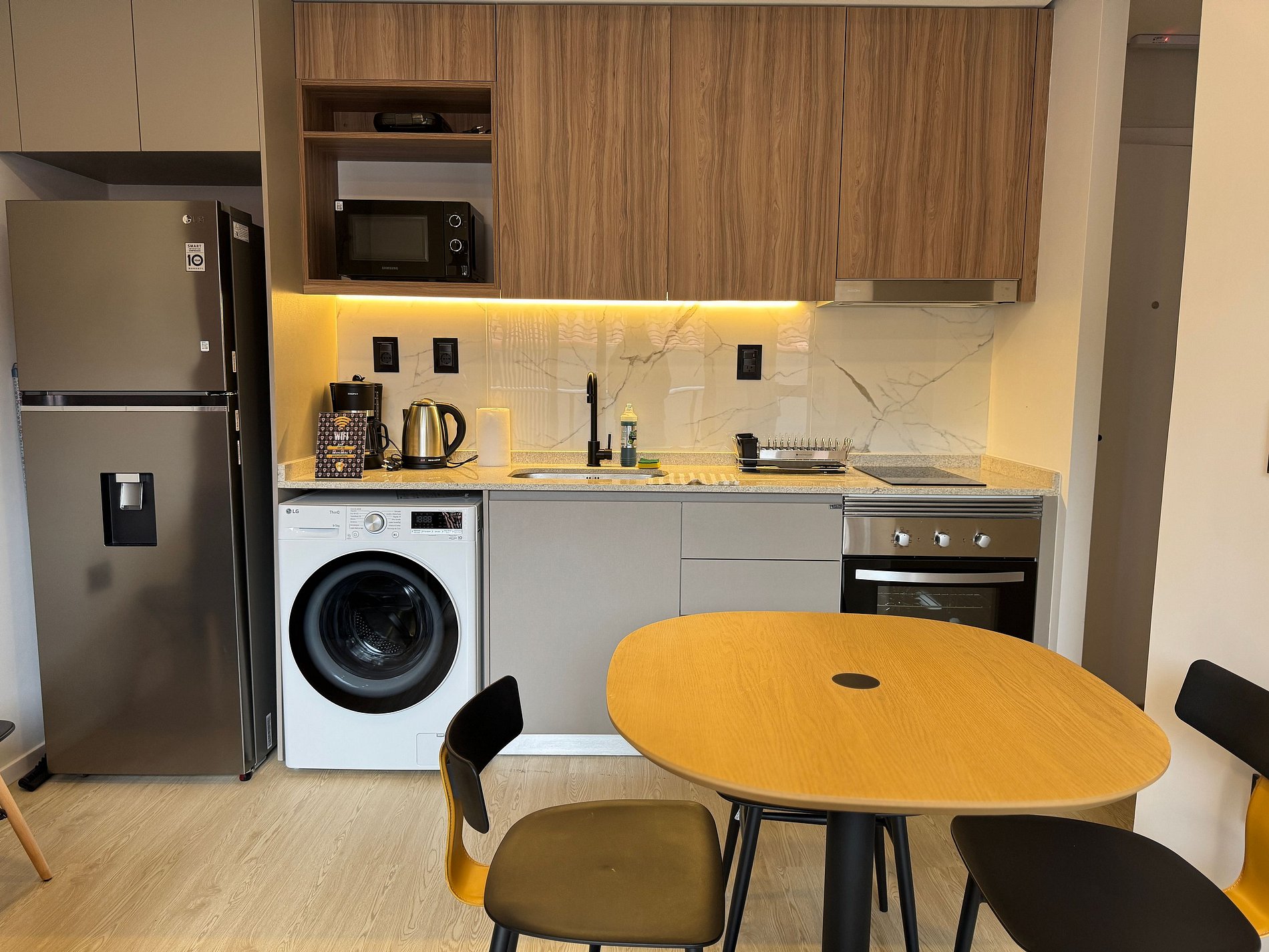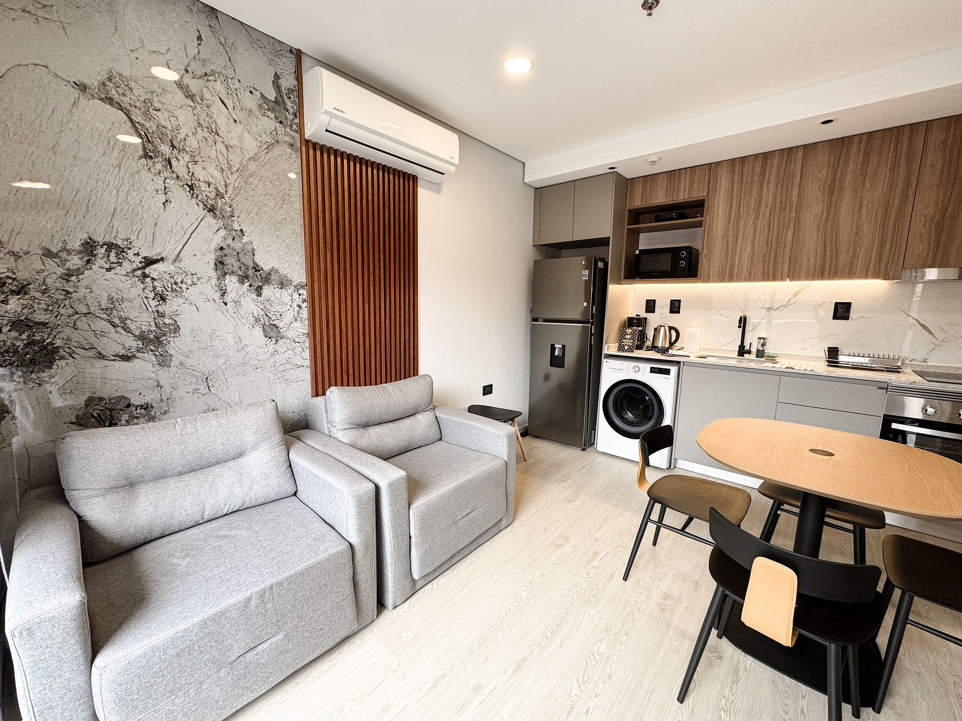 Totalmente equipado con cocina moderna, microondas, cafetera, mixtera, utensilios básicos, W -Fi y Smart Tv. Incluye lavandería en el edificio, seguridad 24 hs, estacionamiento pago sujeto a disponibilidad (opcional) y áreas comunes para trabajar o relajarte.