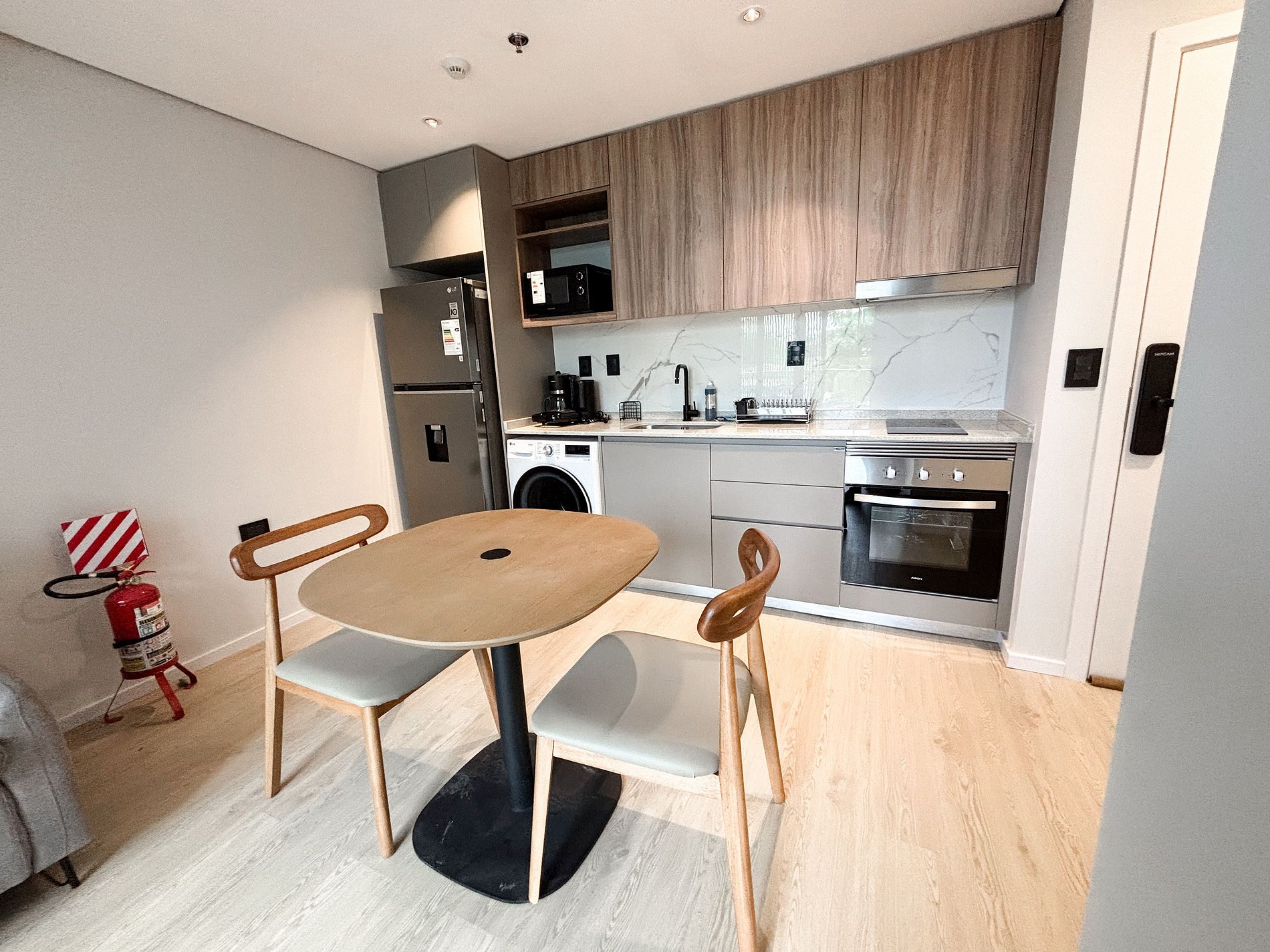 El espacio cuenta con cocina completamente equipada (cafetera, microondas, mixtera y utensilios), Wi-Fi rápido, A/C, Smart TV, lavandería y estacionamiento pago sujeto a disponibilidad (opcional) y seguridad 24 hs. Ideal tanto para estancias cortas como largas.