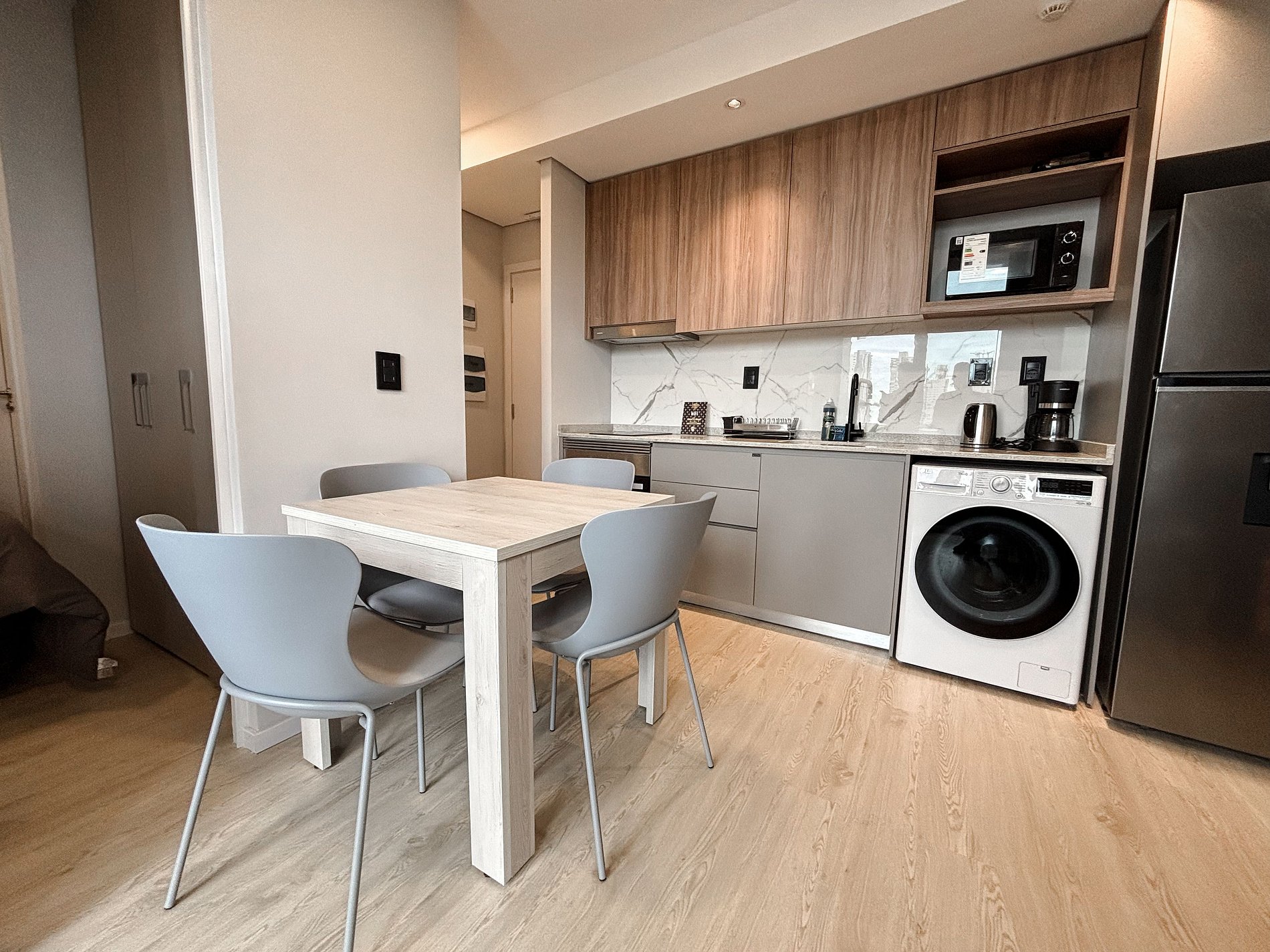 Los huéspedes tienen acceso libre a todas las amenities: piscina, cowork, gimnasio, terraza y laundry. El edificio posee control de acceso con personal de seguridad 24 hs, cámaras en áreas comunes y ascensores inteligentes.