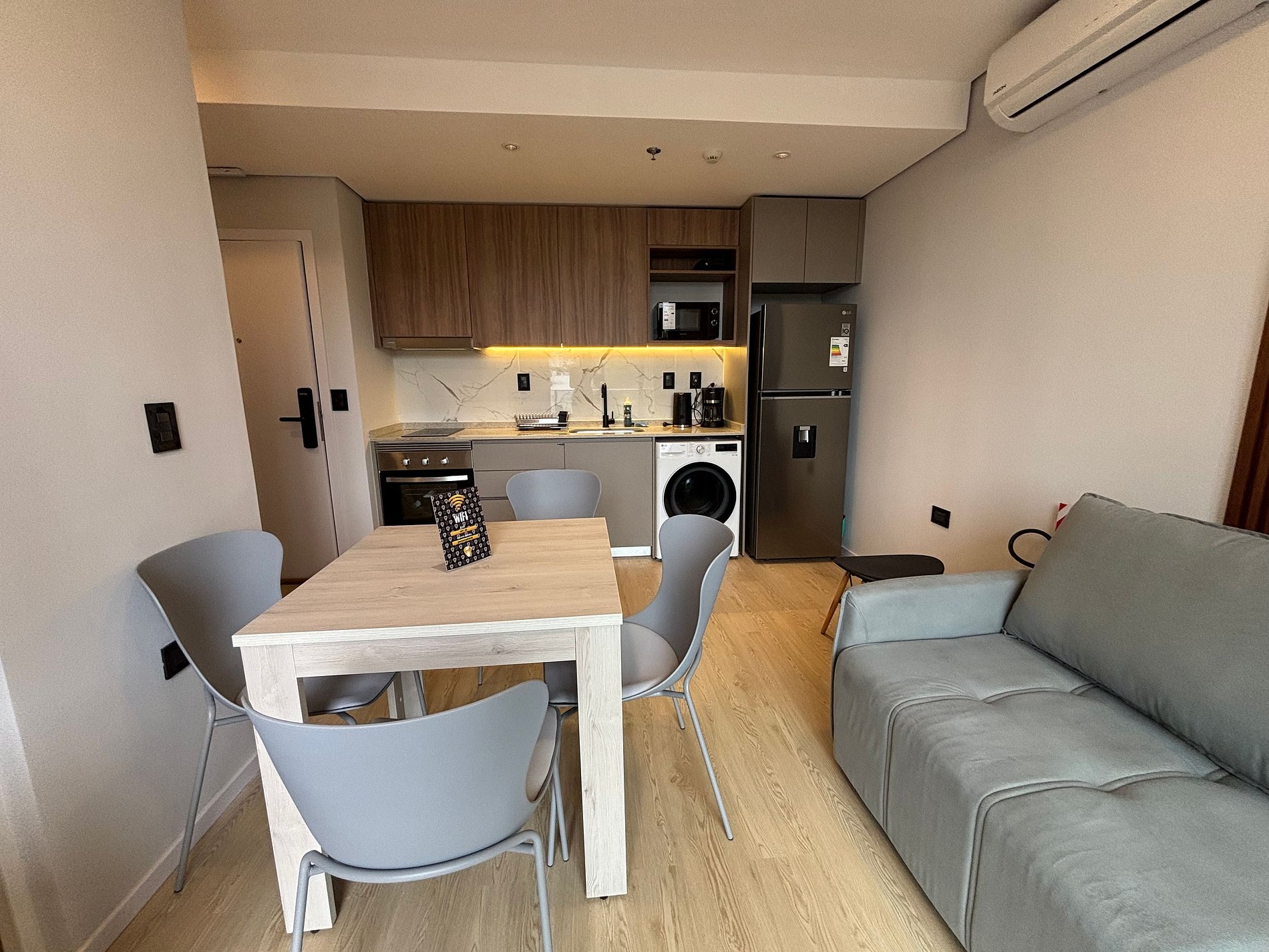 Los huéspedes tienen acceso libre a todas las amenities: piscina, cowork, gimnasio, terraza y laundry. El edificio posee control de acceso con personal de seguridad 24 hs, cámaras en áreas comunes y ascensores inteligentes.
