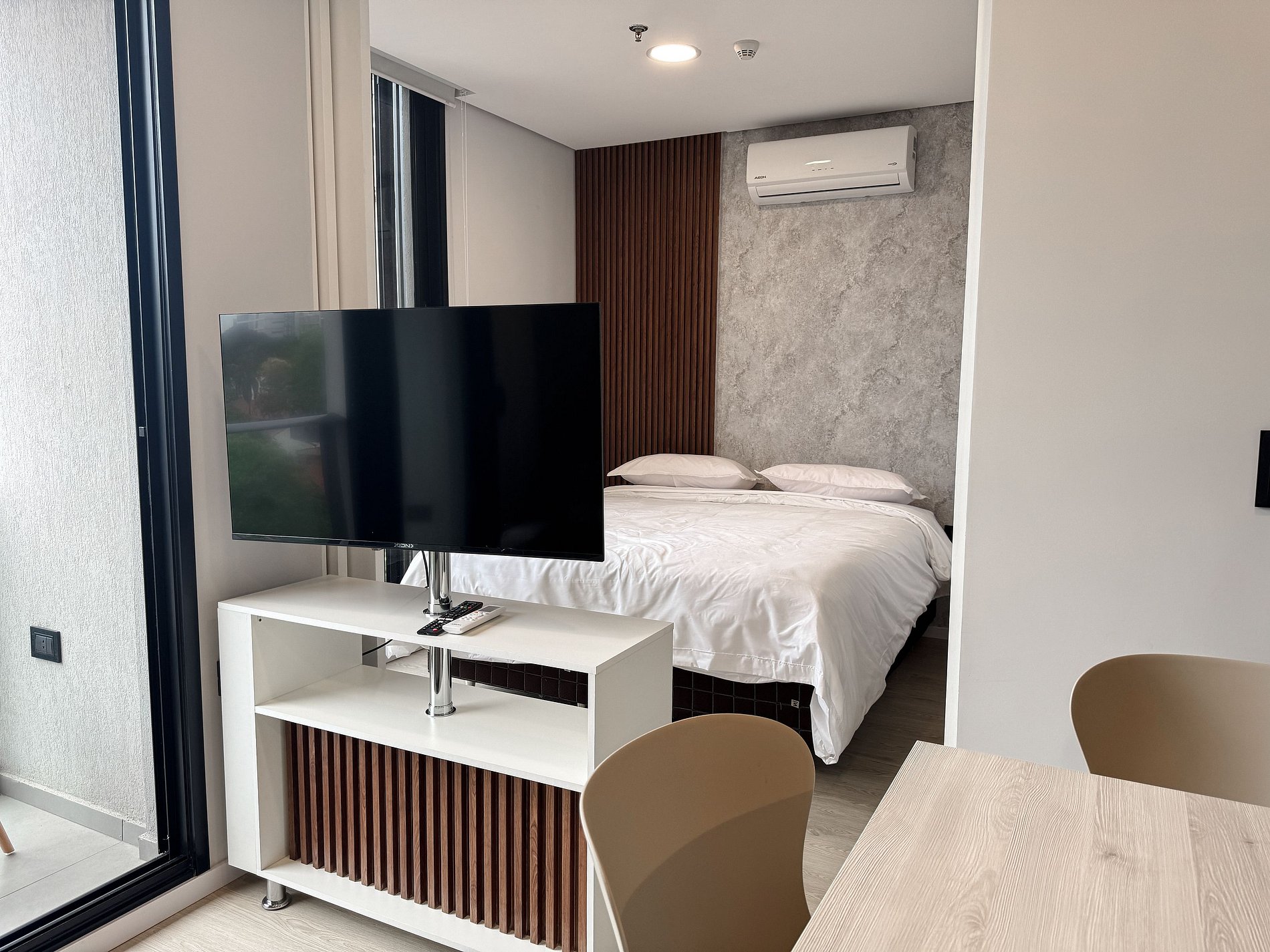 El espacio cuenta con Smart TV, aire acondicionado, cocina equipada, microondas, cafetera, mixtera, heladera, utensilios y mobiliario contemporáneo. El edificio ofrece cowork silencioso, gimnasio moderno, piscina, terrazas con barra, laundry y seguridad 24 hs. Estacionamiento pago sujeto a disponibilidad (opcional)