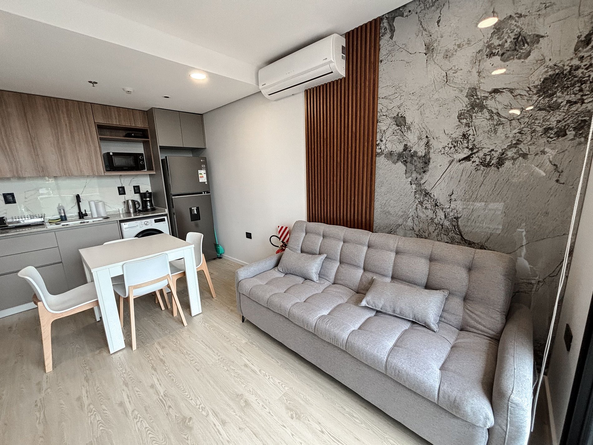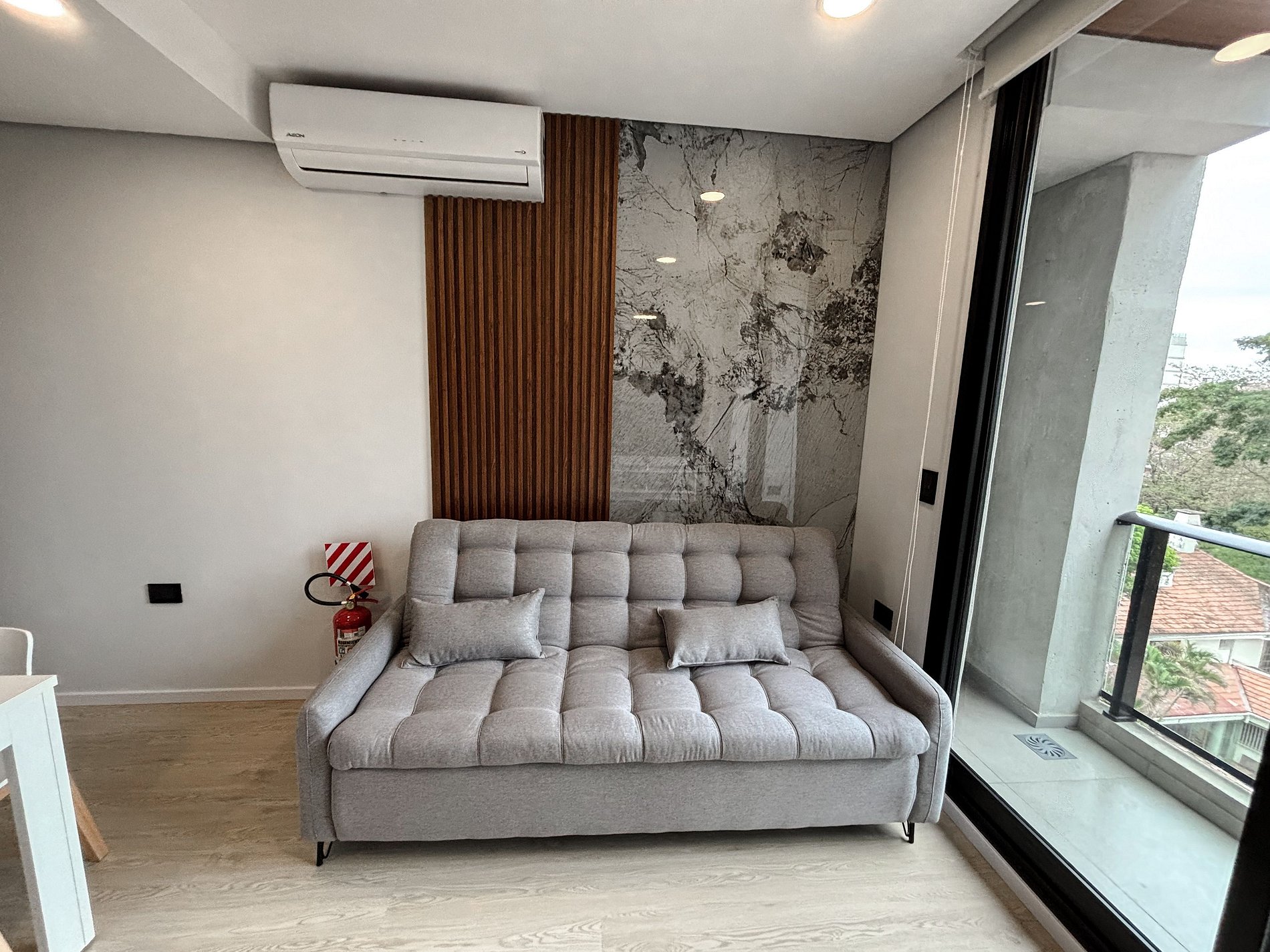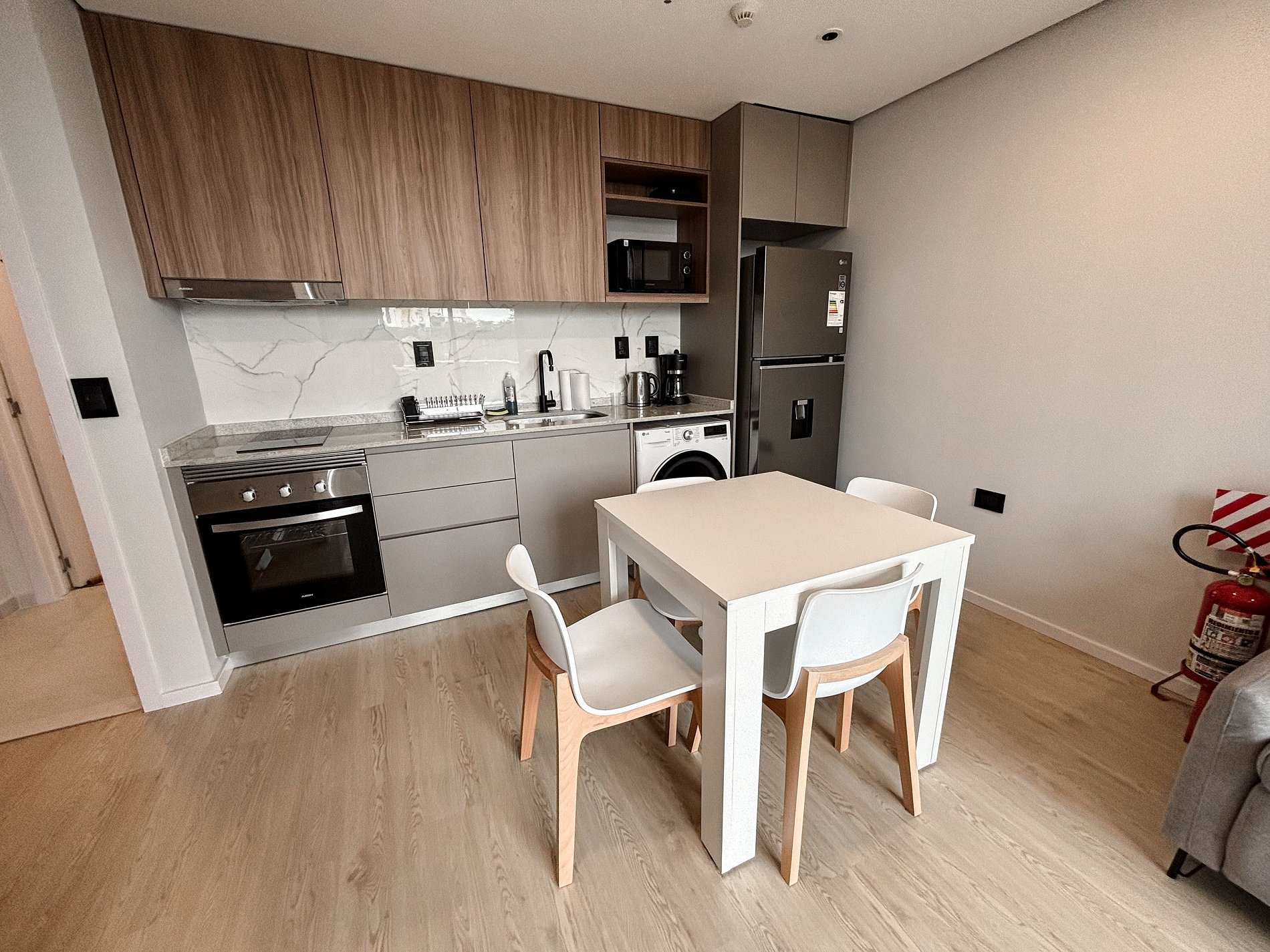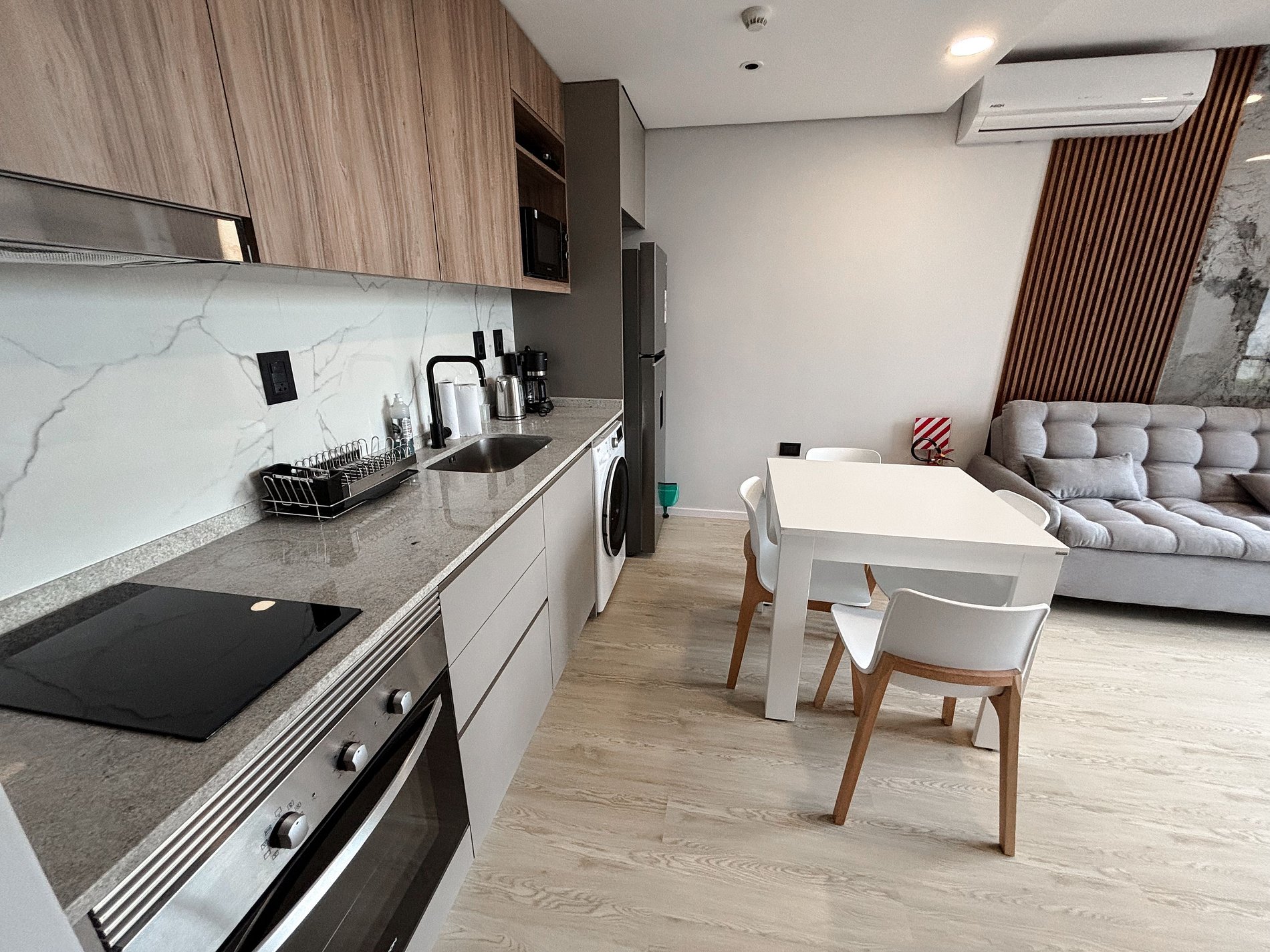 Equipado con Smart TV, cocina completa, electrodomésticos premium, cafetera, microondas, mixtera, heladera, aire acondicionado y utensilios de cocina. El edificio ofrece piscina amplia, gimnasio moderno, cowork elegante, terrazas con barra, laundry, ascensores, estacionamiento pago sujeto a disponibilidad (opcional) y seguridad 24hs.
